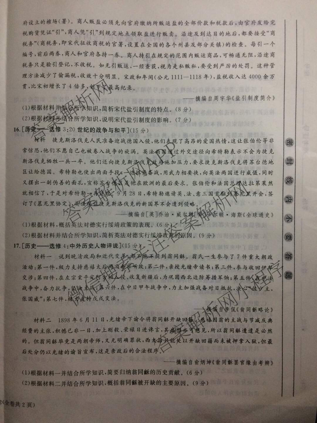 - 2021年高考单科综合题型卷(全国卷)二历史答案