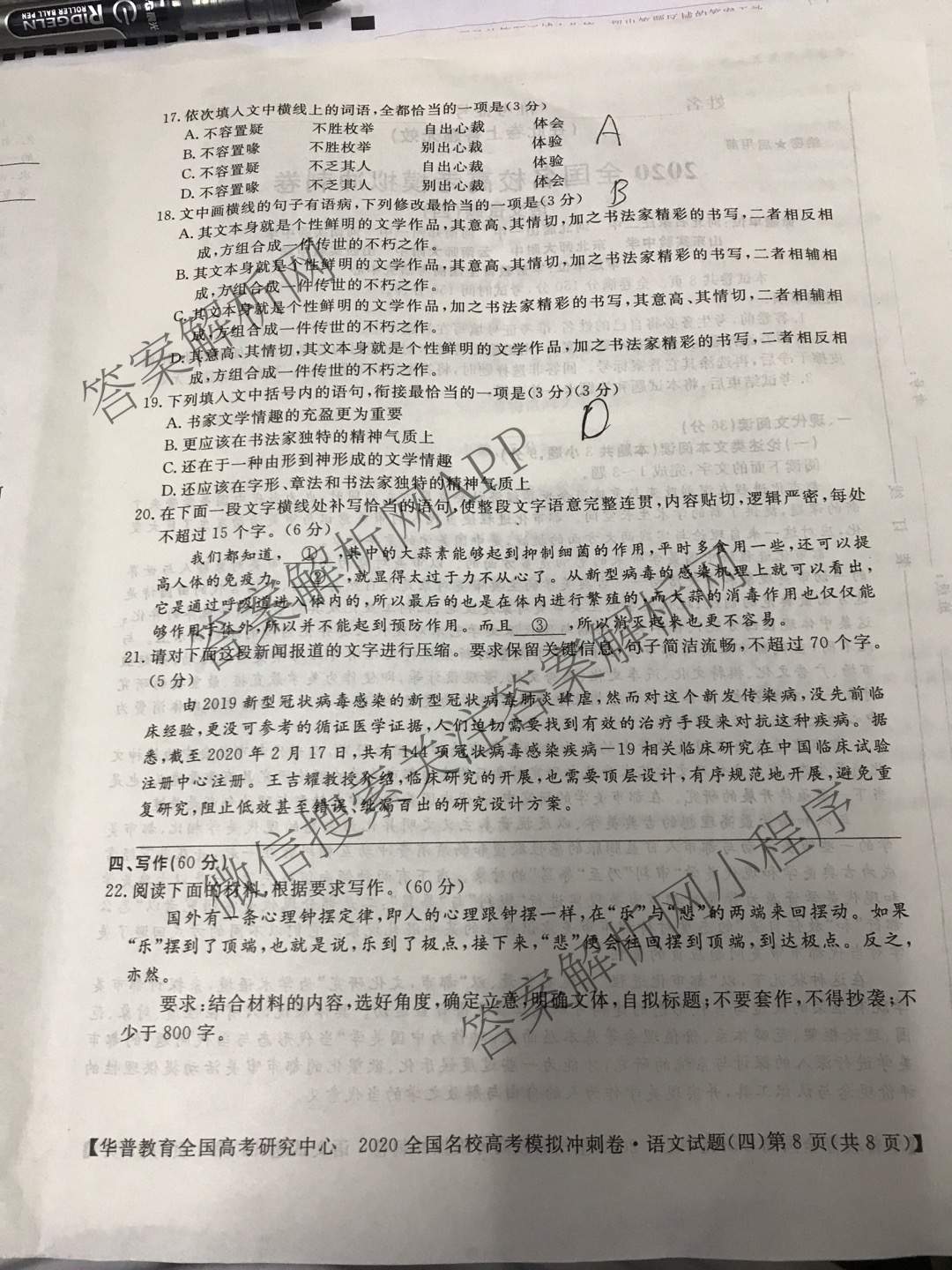 华普教育·2020全国名校高考模拟冲刺卷(四)语文试题,目前分科卷答案网已经汇总了华普教育·2020全国名校高考模拟冲刺卷(四)语文试题的各科答案和试卷,获取更多华普教育答案解析,请在关注本站。