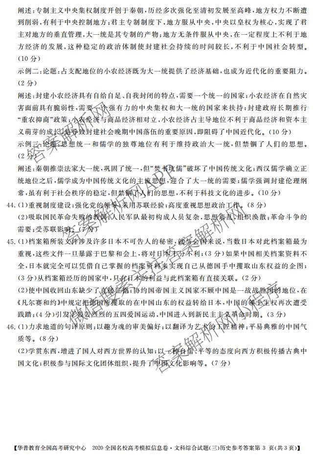 华普教育2020全国名校高考模拟信息卷(三)文综历史答案
