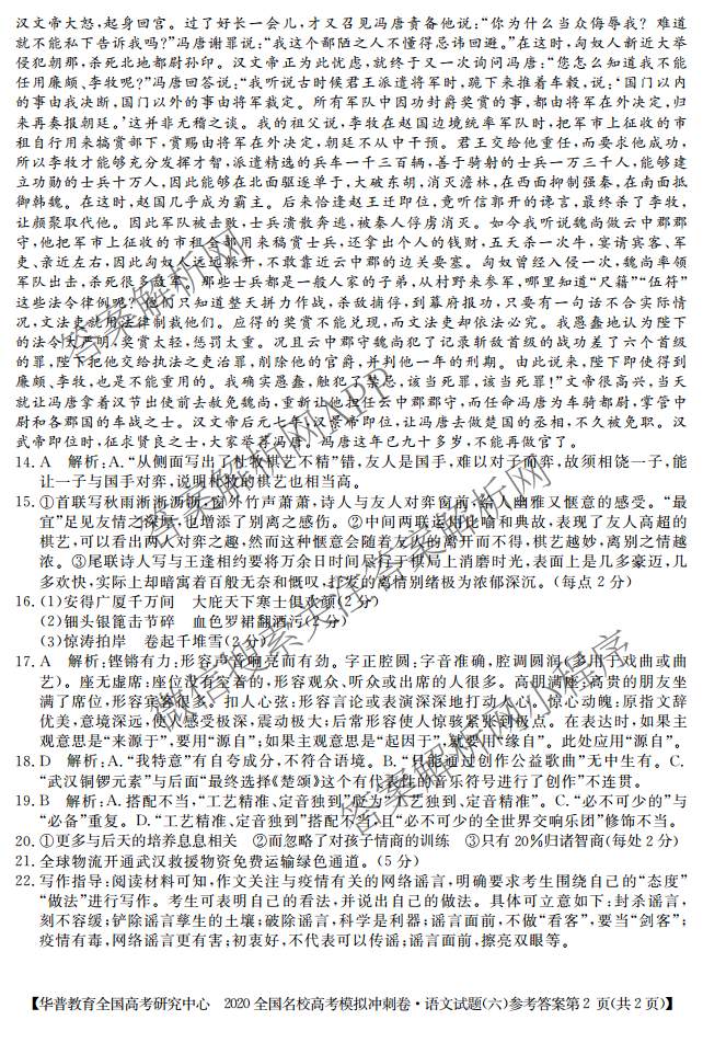 - (华普教育)2020全国名校高考模拟冲刺卷(六)语文答案