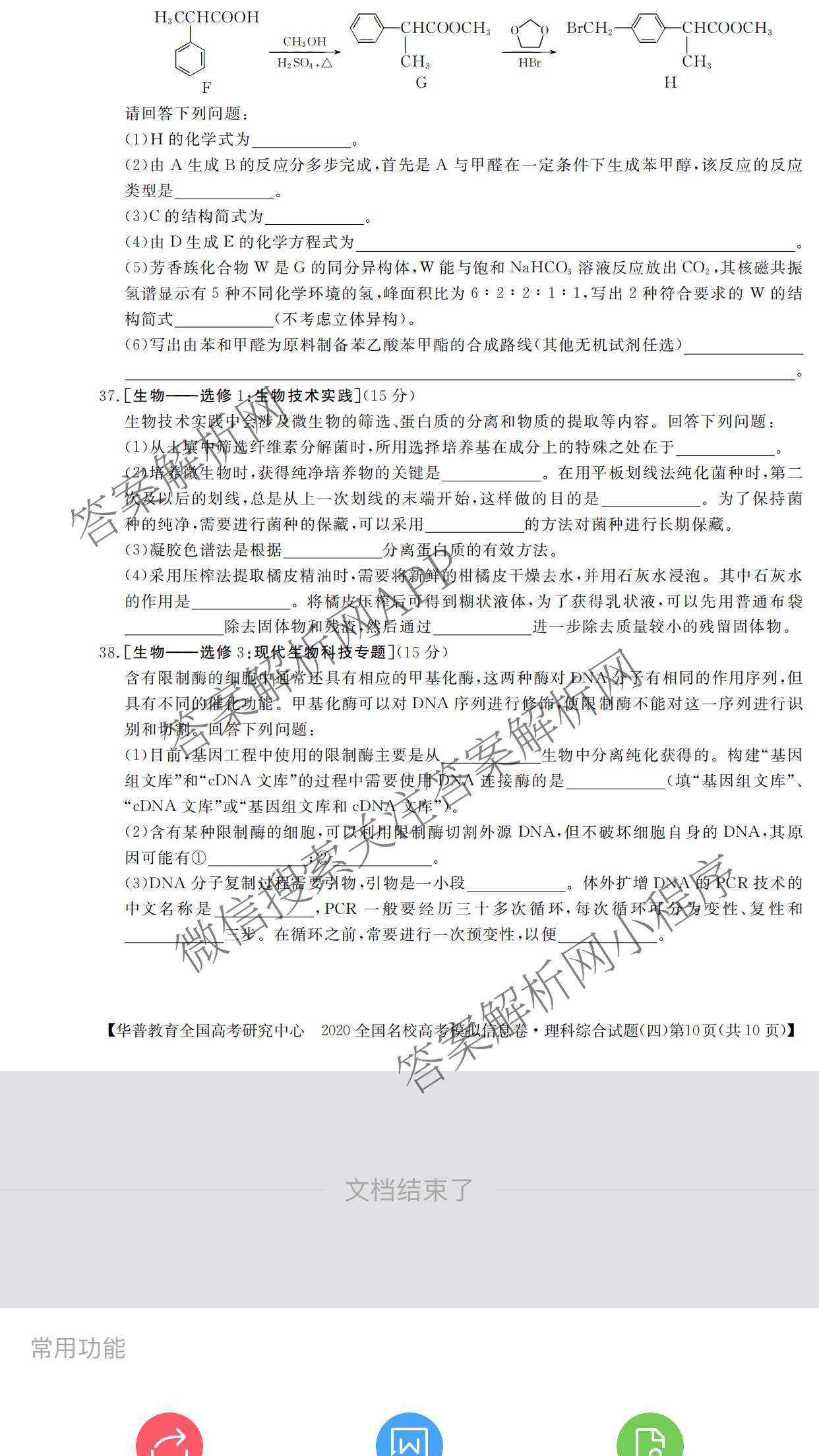 - [华普教育]2020全国名校高考模拟信息卷(四)理综生物试题