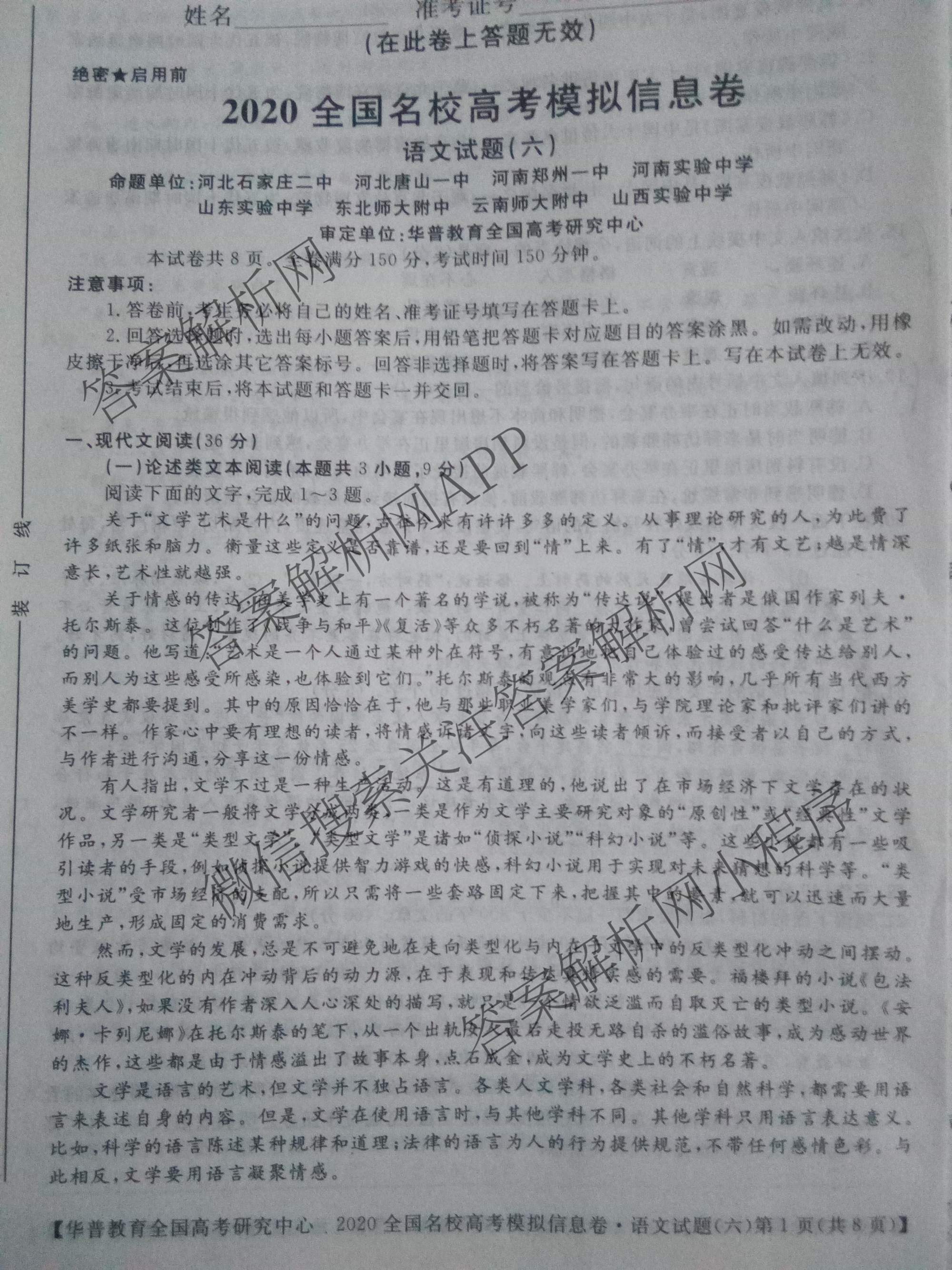 - [华普教育]·2020全国名校高考模拟信息卷(六)语文试题