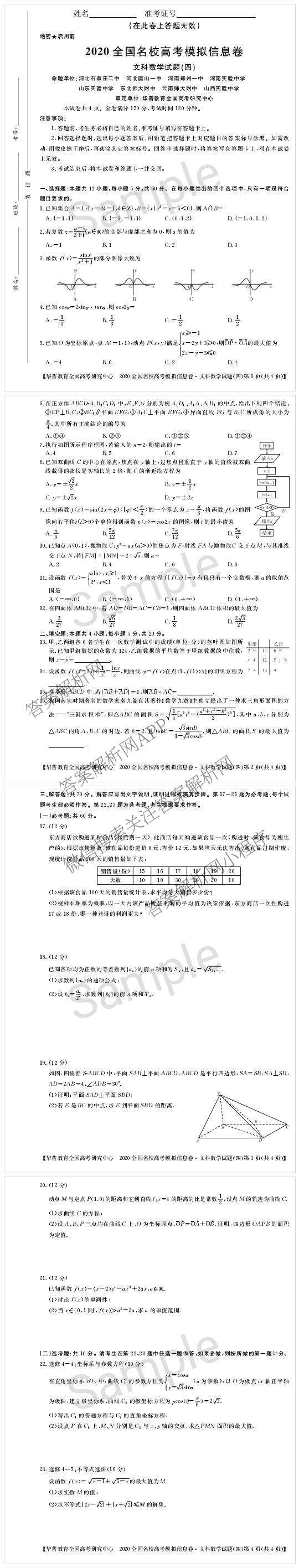 华普教育2020全国名校高考模拟信息卷(四)文科数学试题