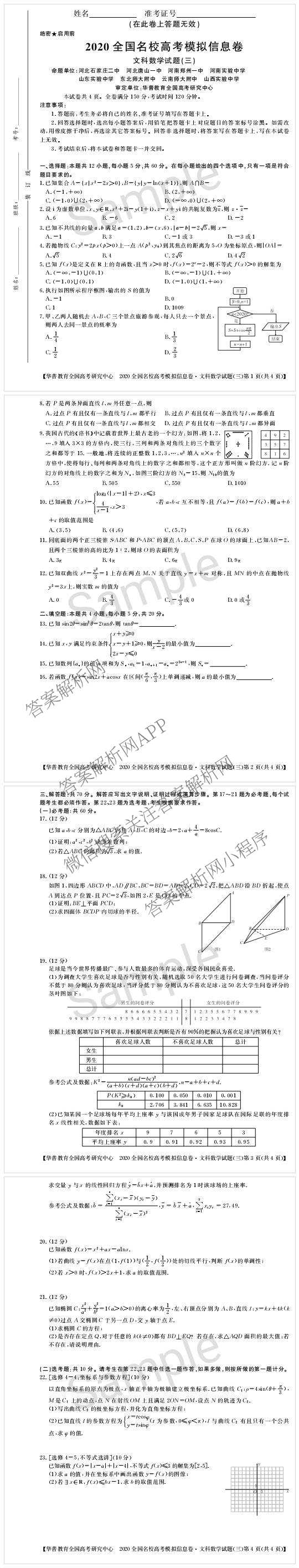 华普教育·2020全国名校高考模拟信息卷(三)文科数学试题,目前分科卷答案网已经汇总了华普教育·2020全国名校高考模拟信息卷(三)文科数学试题的各科答案和试卷,获取更多华普教育答案解析,请在关注本站。