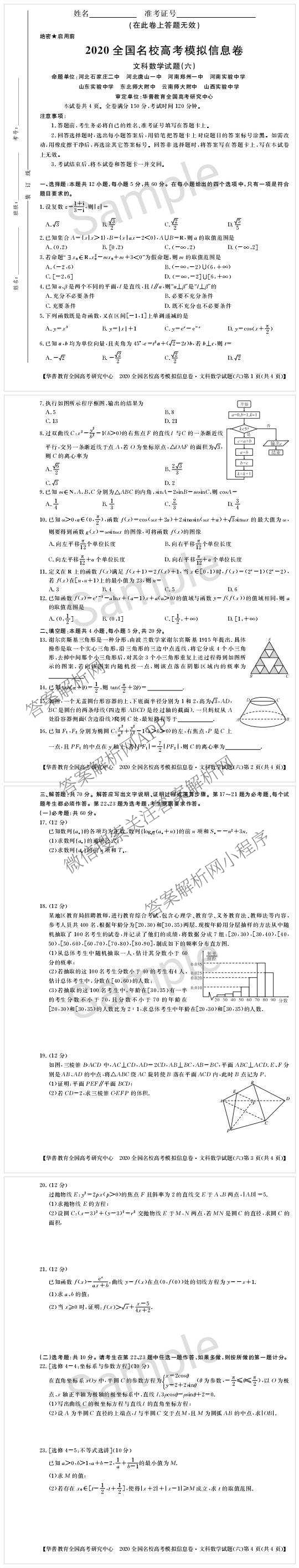 - [华普教育]2020全国名校高考模拟信息卷(六)理科数学试题