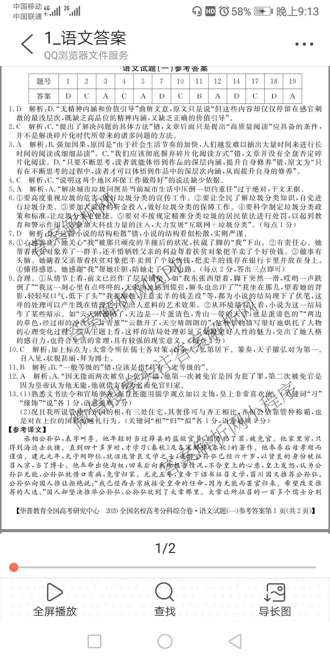 (华普教育)2020全国名校高考分科综合卷(一)语文答案