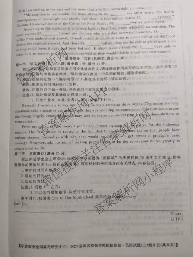 华普教育·2020全国名校高考模拟信息卷(二)英语试题,目前分科卷答案网已经汇总了华普教育·2020全国名校高考模拟信息卷(二)英语试题的各科答案和试卷,获取更多华普教育答案解析,请在关注本站。