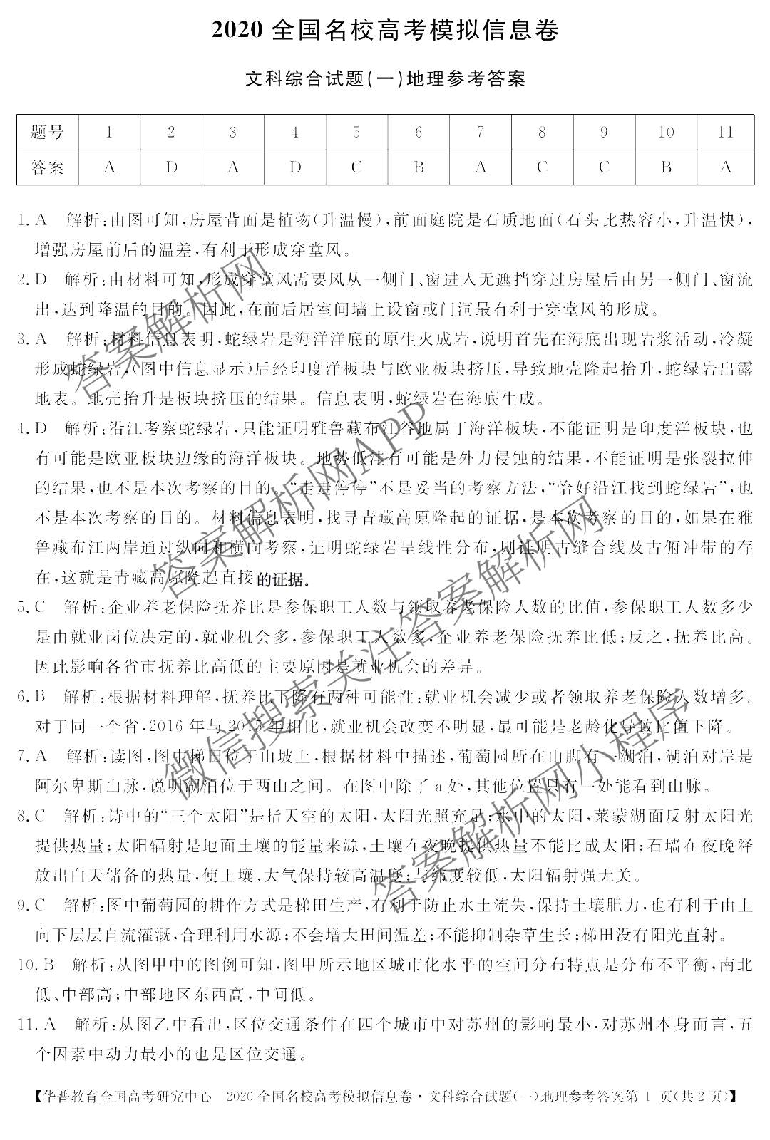 华普教育2020全国名校高考模拟信息卷(一)文科综合答案