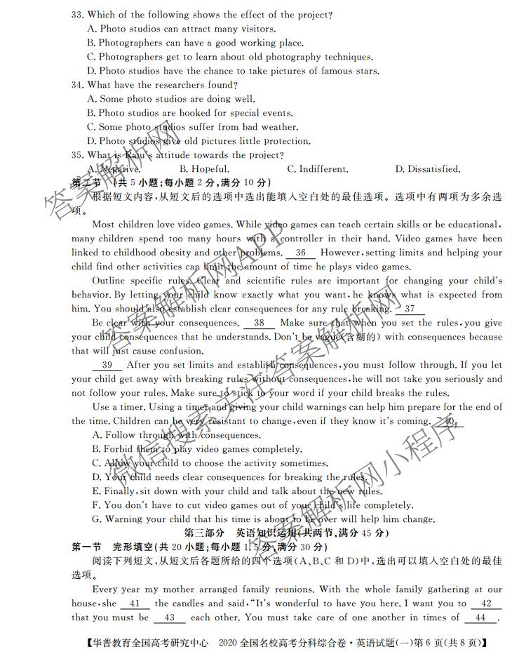 - 华普教育2020全国名校高考分科综合卷(一)英语答案