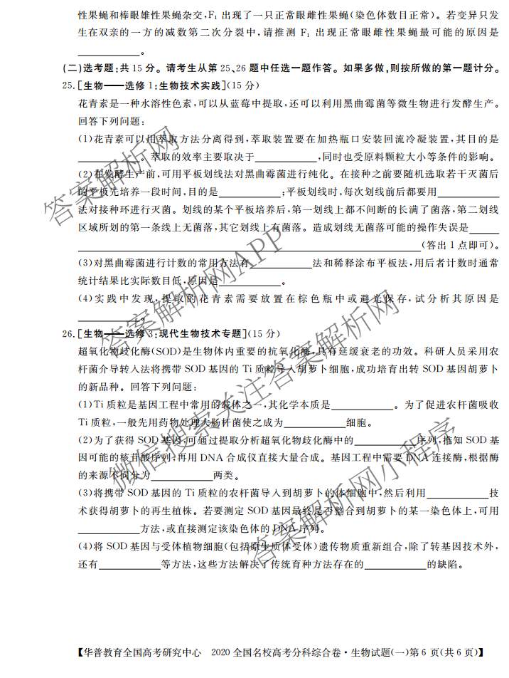 华普教育2020全国名校高考分科综合卷(一)生物试题