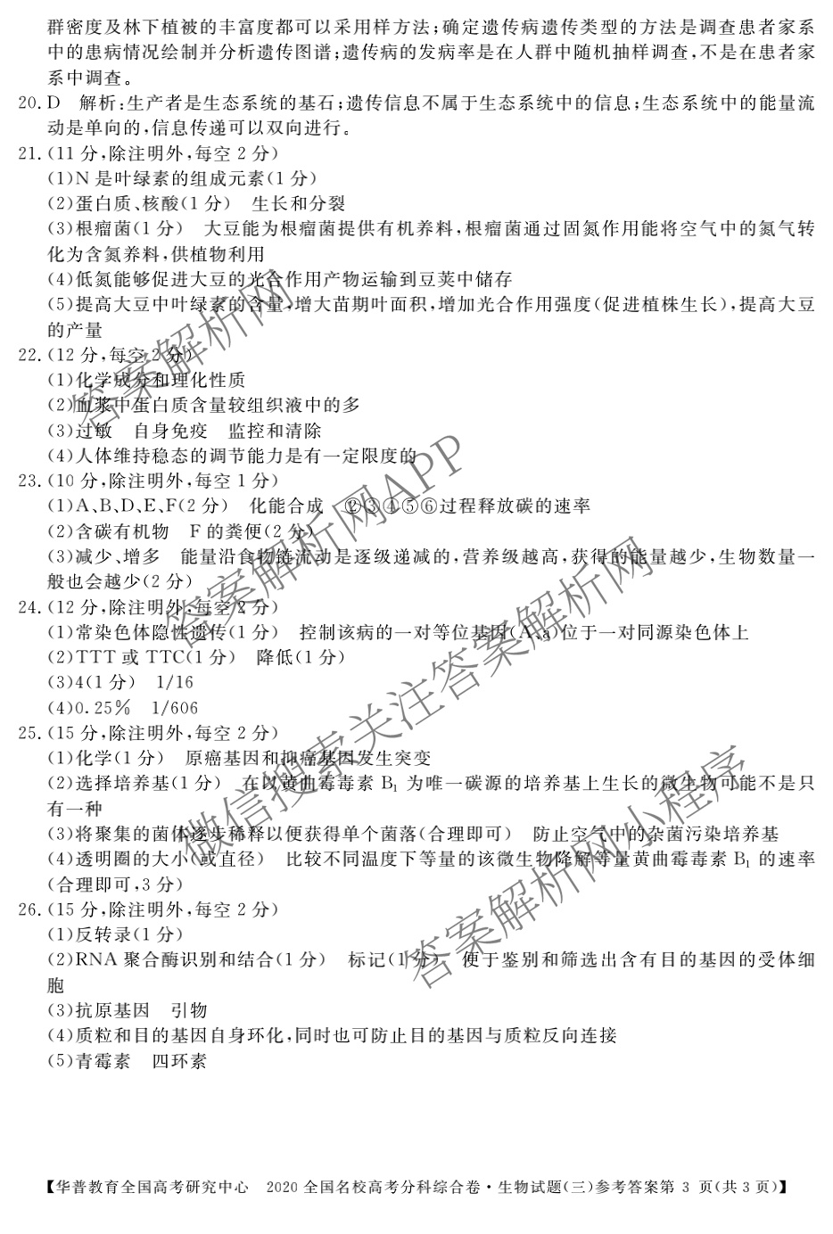 - 华普教育2020全国名校高考分科综合卷(三)生物答案