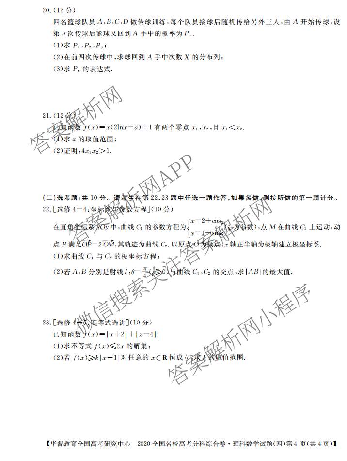 - 华普教育2020全国名校高考分科综合卷(四)理科数学试题