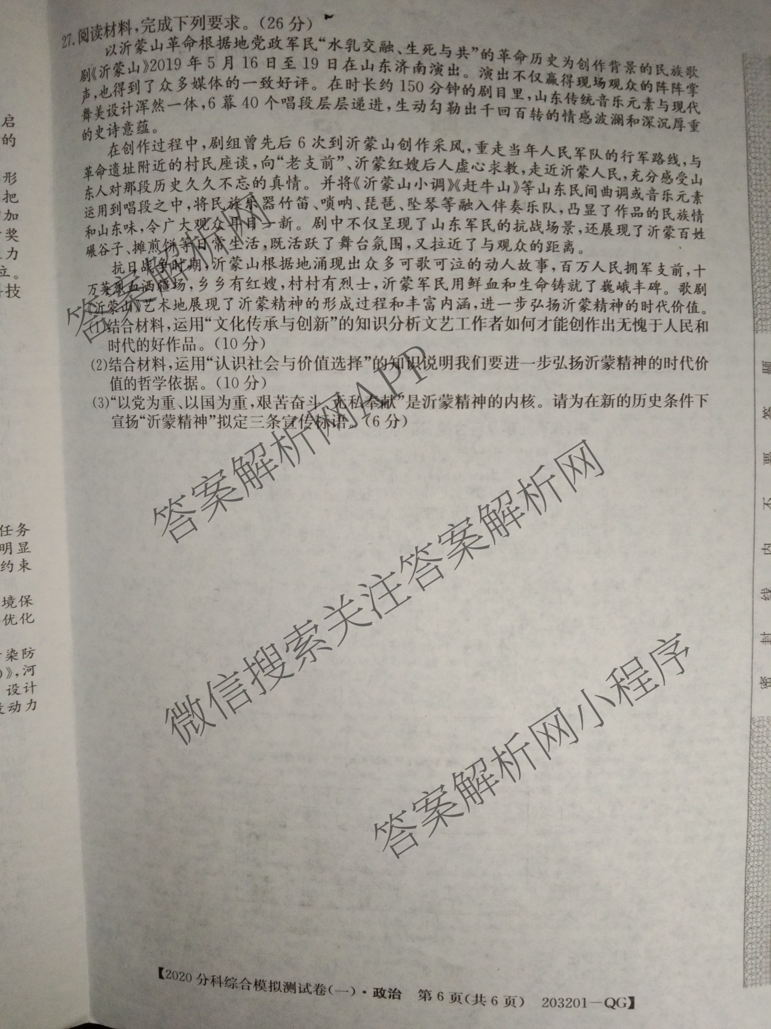 - 2020届(全国高考分科综合模拟测试卷)(一)203201政治答案