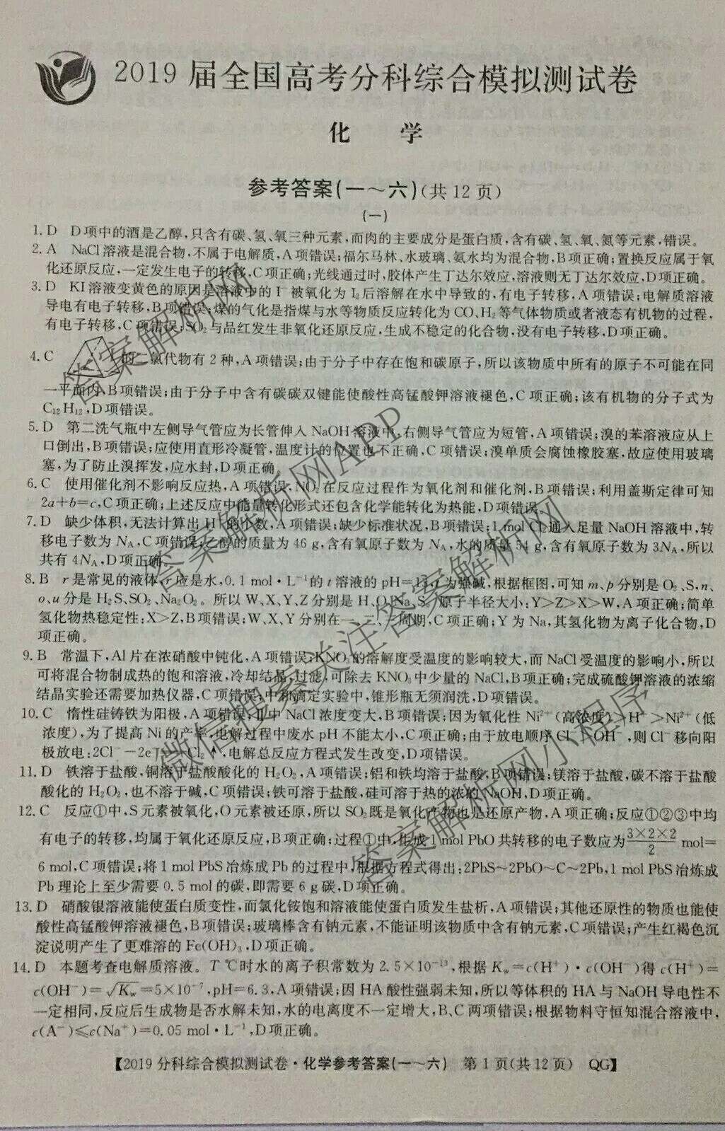 2019全国高考分科综合模拟测试卷(一)1化学