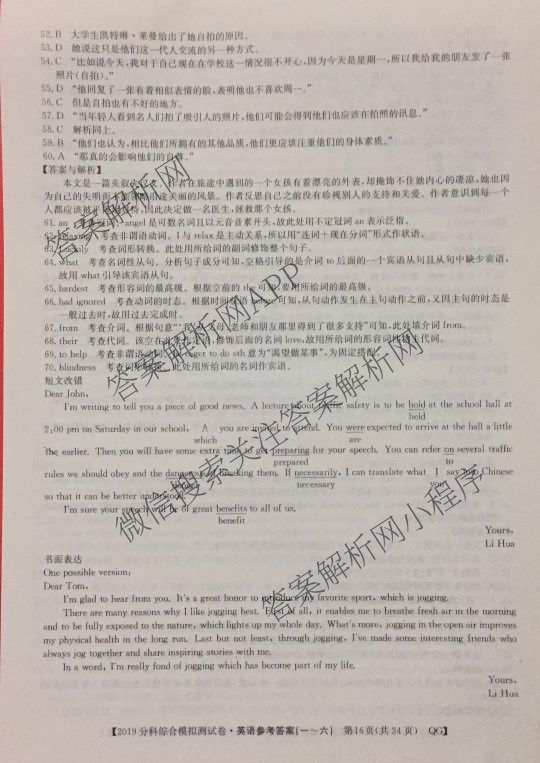 2019届全国高考分科综合模拟测试卷英语四(4)答案