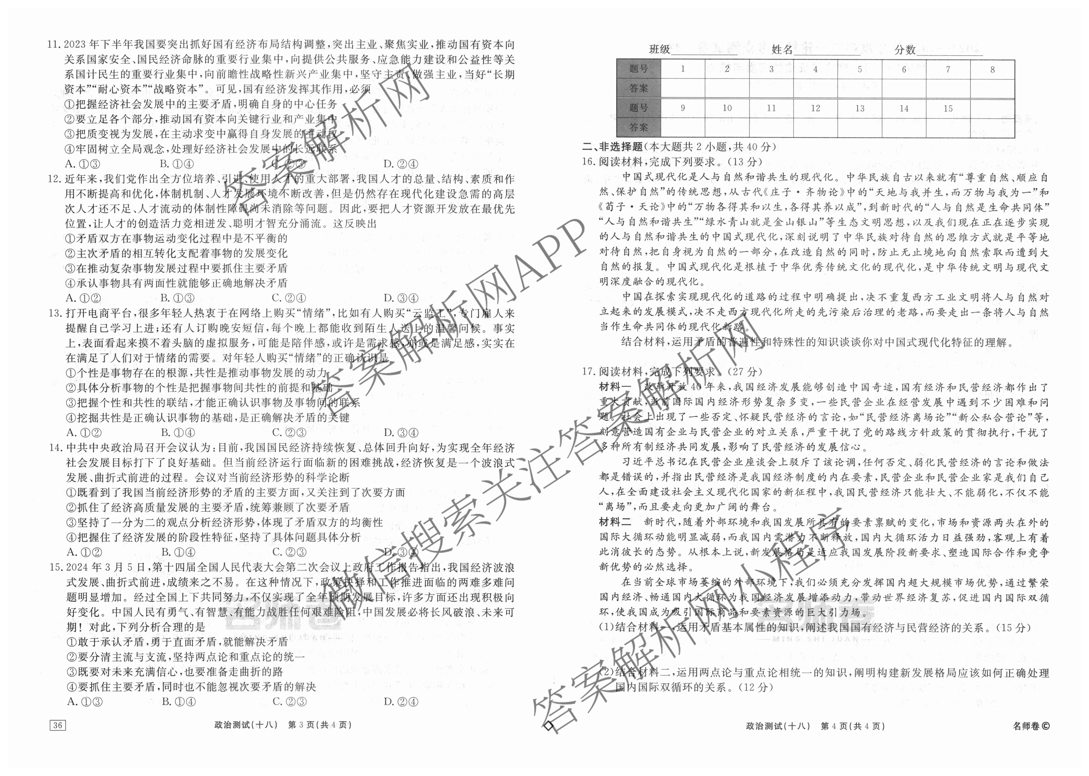 衡水名师卷2024-2025学年度高三一轮复习考点测试卷政治(40分钟空心菱形)(十八)18试题