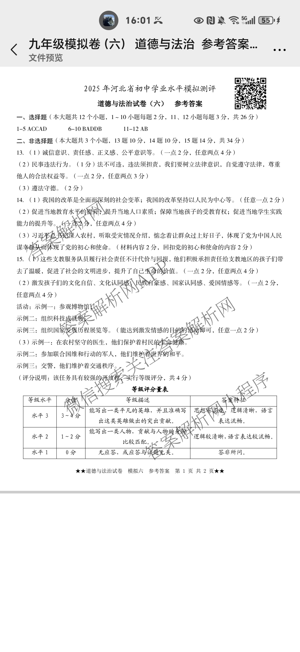 [九年级]2025年[河北省初中学业水平模拟测评](六)二星道德与法治答案