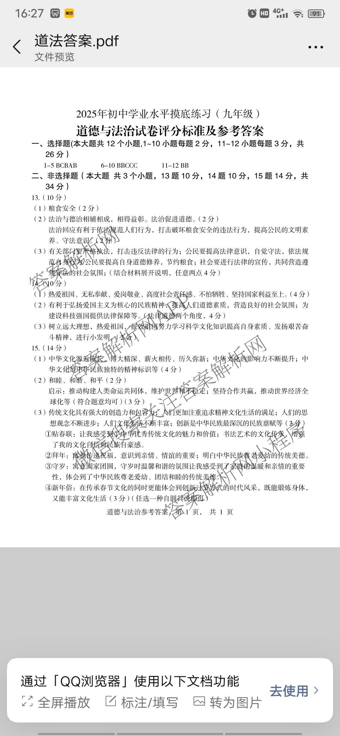 河北省2025年初中学业水平摸底练习([九年级])道德与法治答案