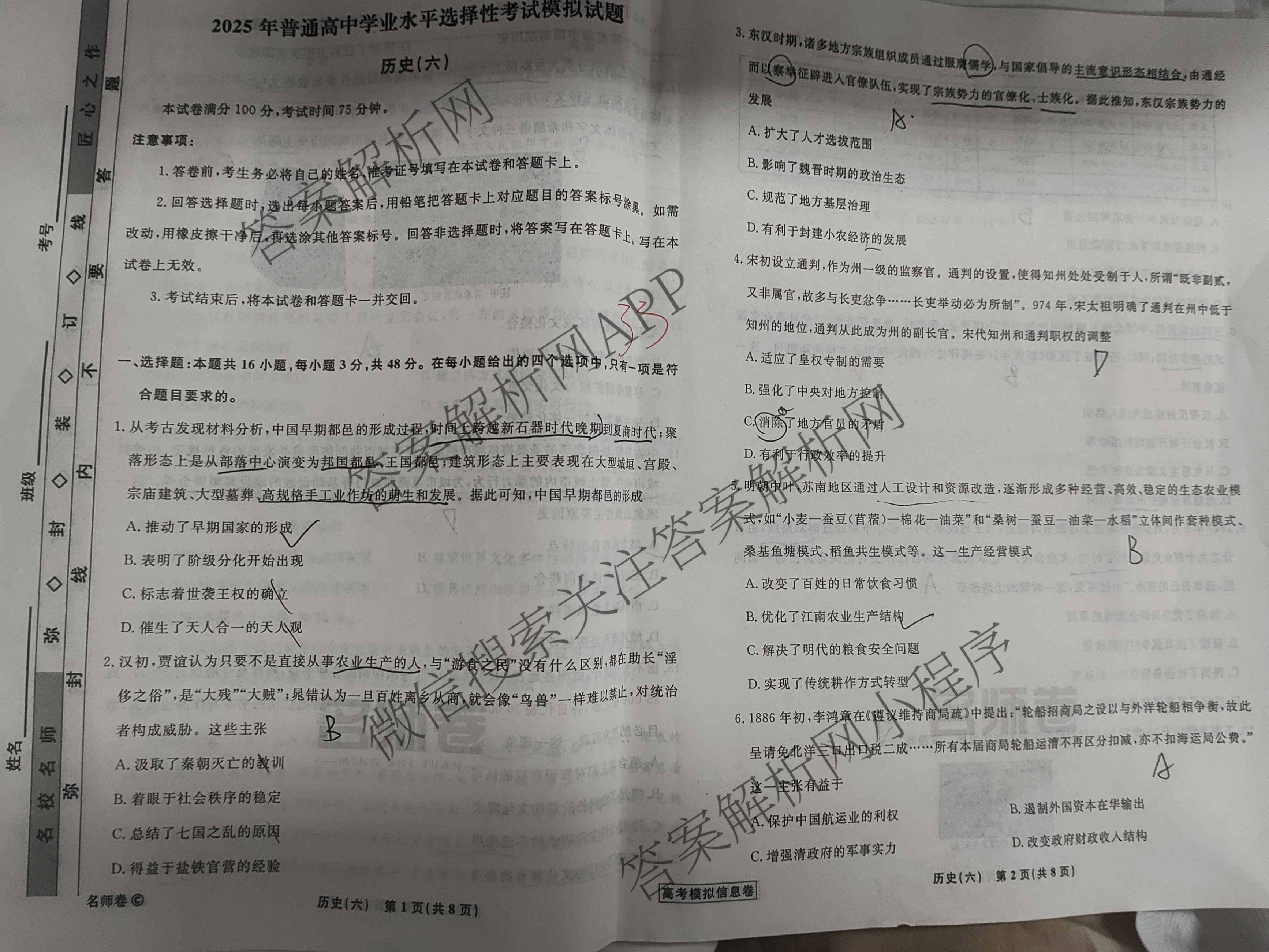 衡水名师卷高考模拟信息卷2025年普通高等学校招生全国统一考试模拟(六)6历史(空心菱形)答案