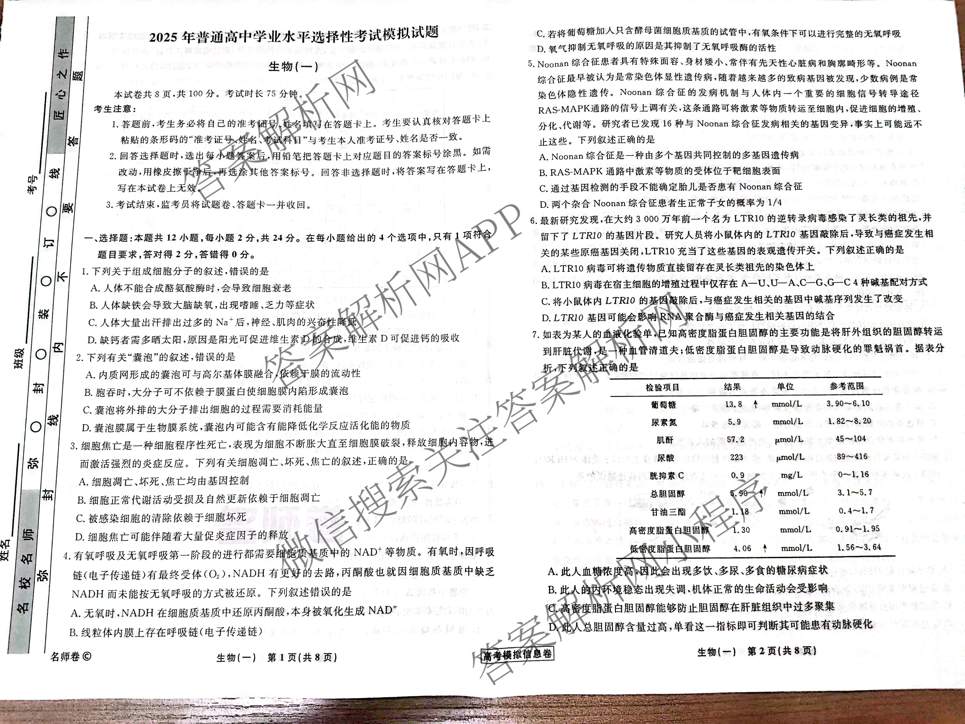 衡水名师卷高考模拟信息卷2025年普通高等学校招生全国统一考试模拟(一)1生物(空心圆)答案