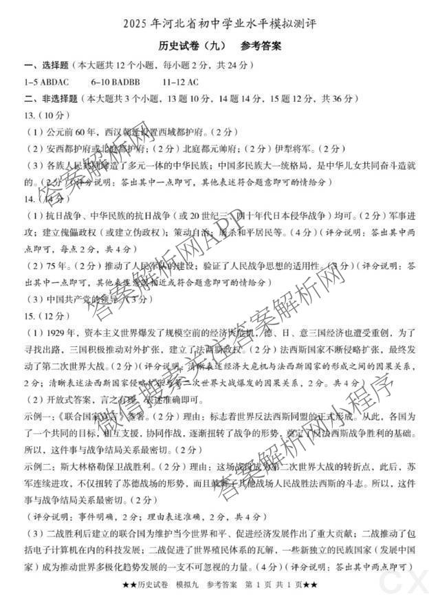 2025年河北省初中学业水平模拟测评(九)二星历史答案,目前分科卷答案网已经汇总了2025年河北省初中学业水平模拟测评(九)二星历史答案的各科答案和试卷,获取更多河北省初中学业水平模拟测评答案解析,请在关注本站。