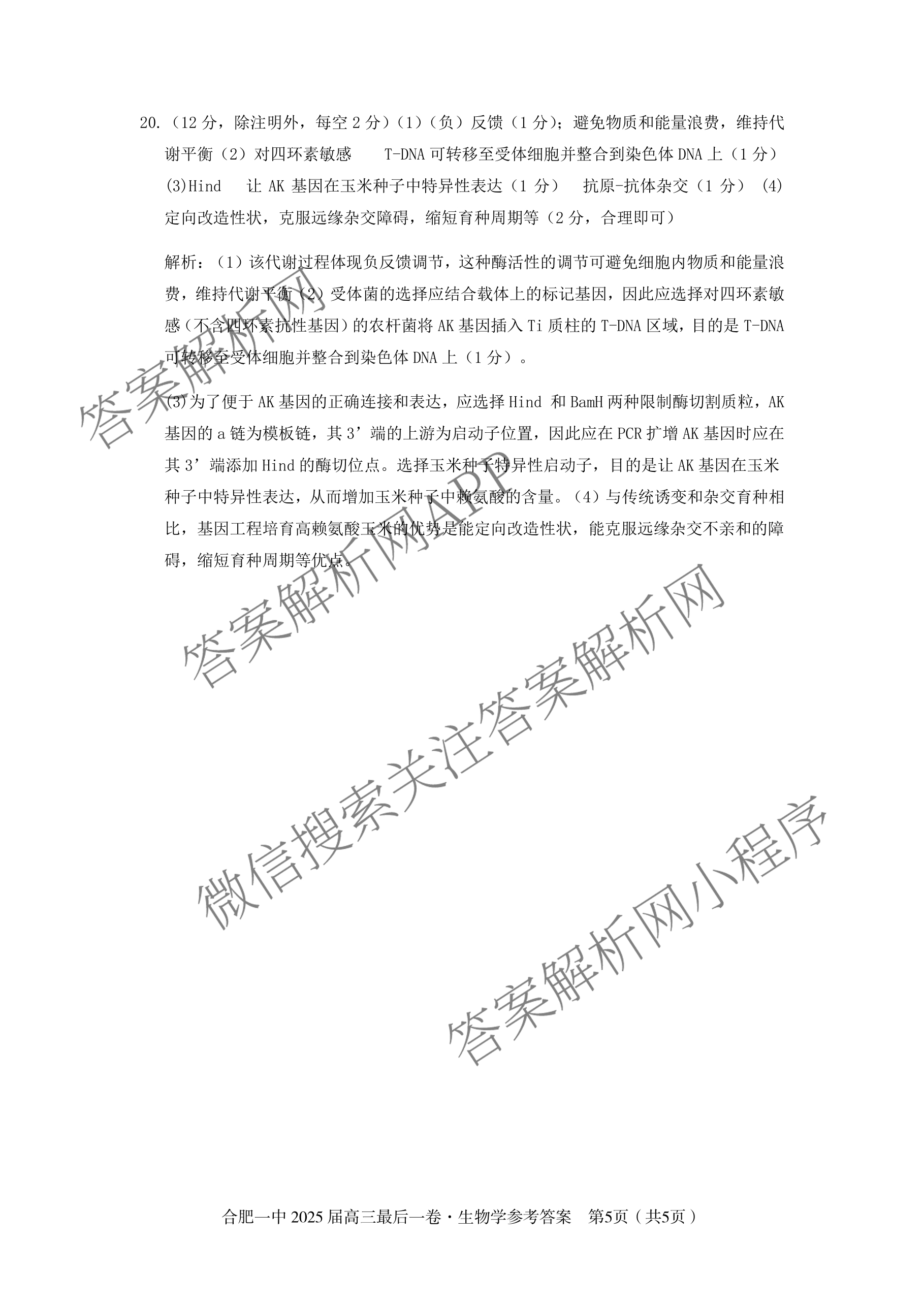 - 安徽省十联考合肥一中2025届[高三]最后一卷生物答案