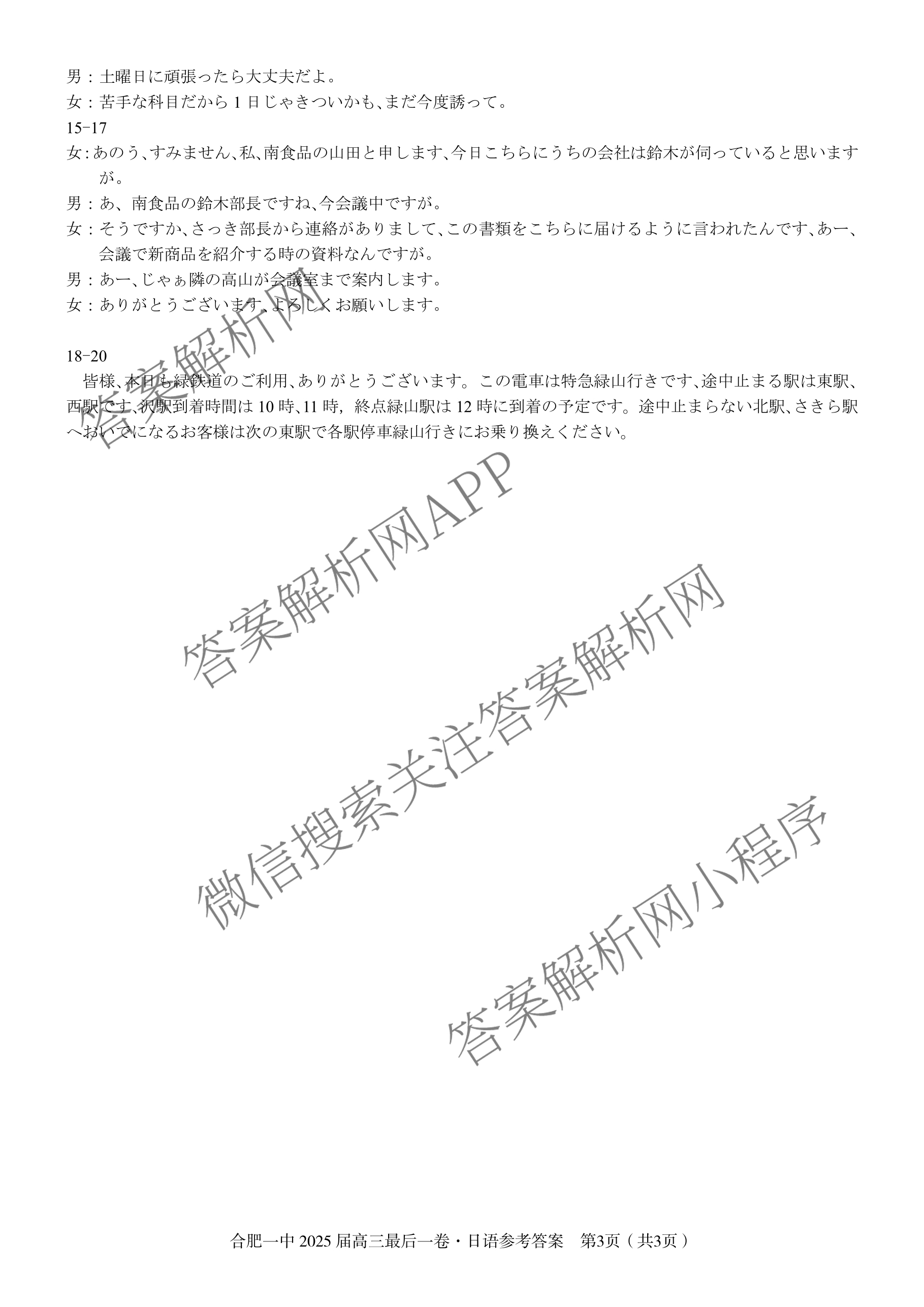 [高三]安徽省十联考合肥一中2025届最后一卷日语答案