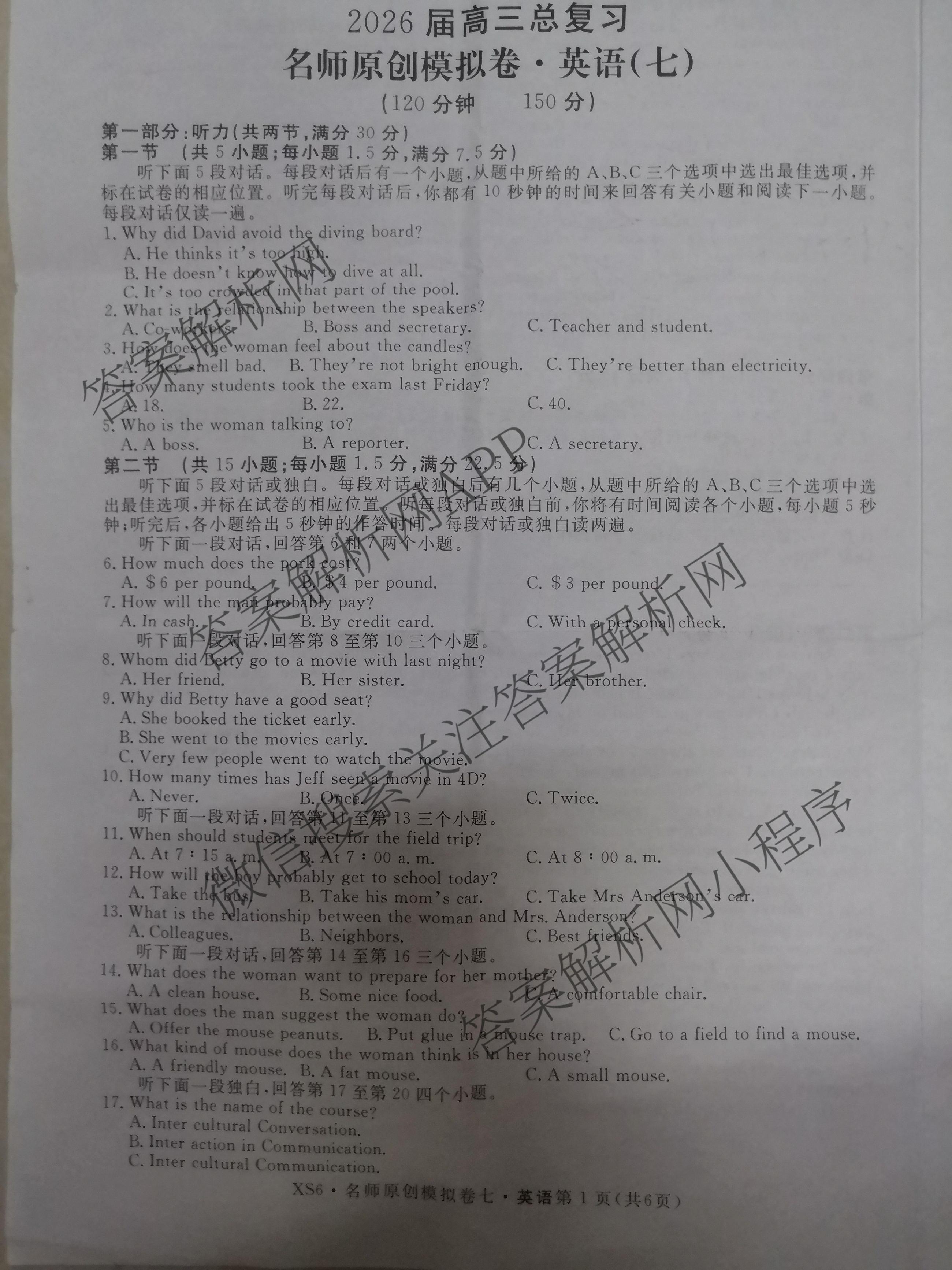 - 2026届[(高三)总复习名师原创模拟](七)7英语(XS6)答案