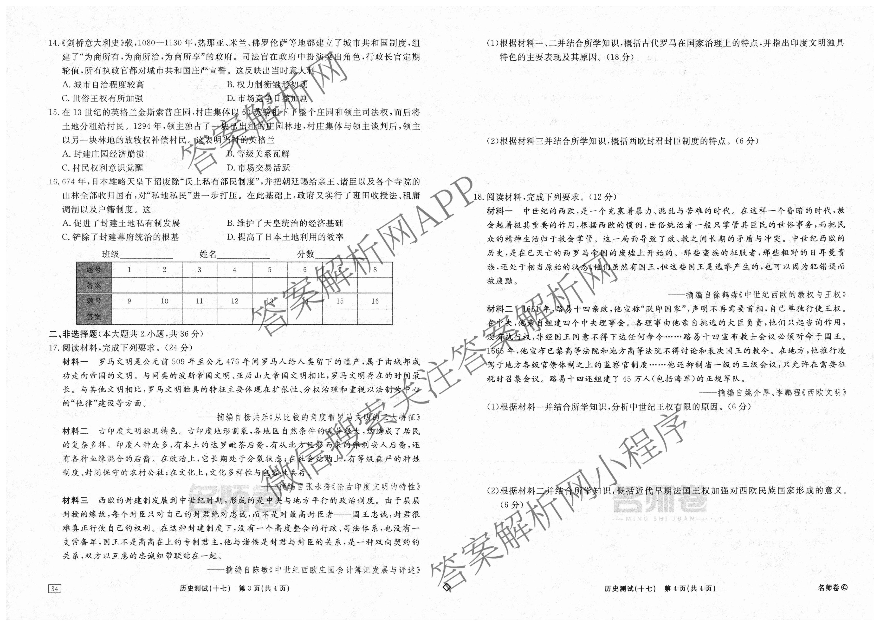 衡水名师卷2025-2026学年度高三一轮复习考点测试卷(十七)17历史(40分钟空心菱形)试题
