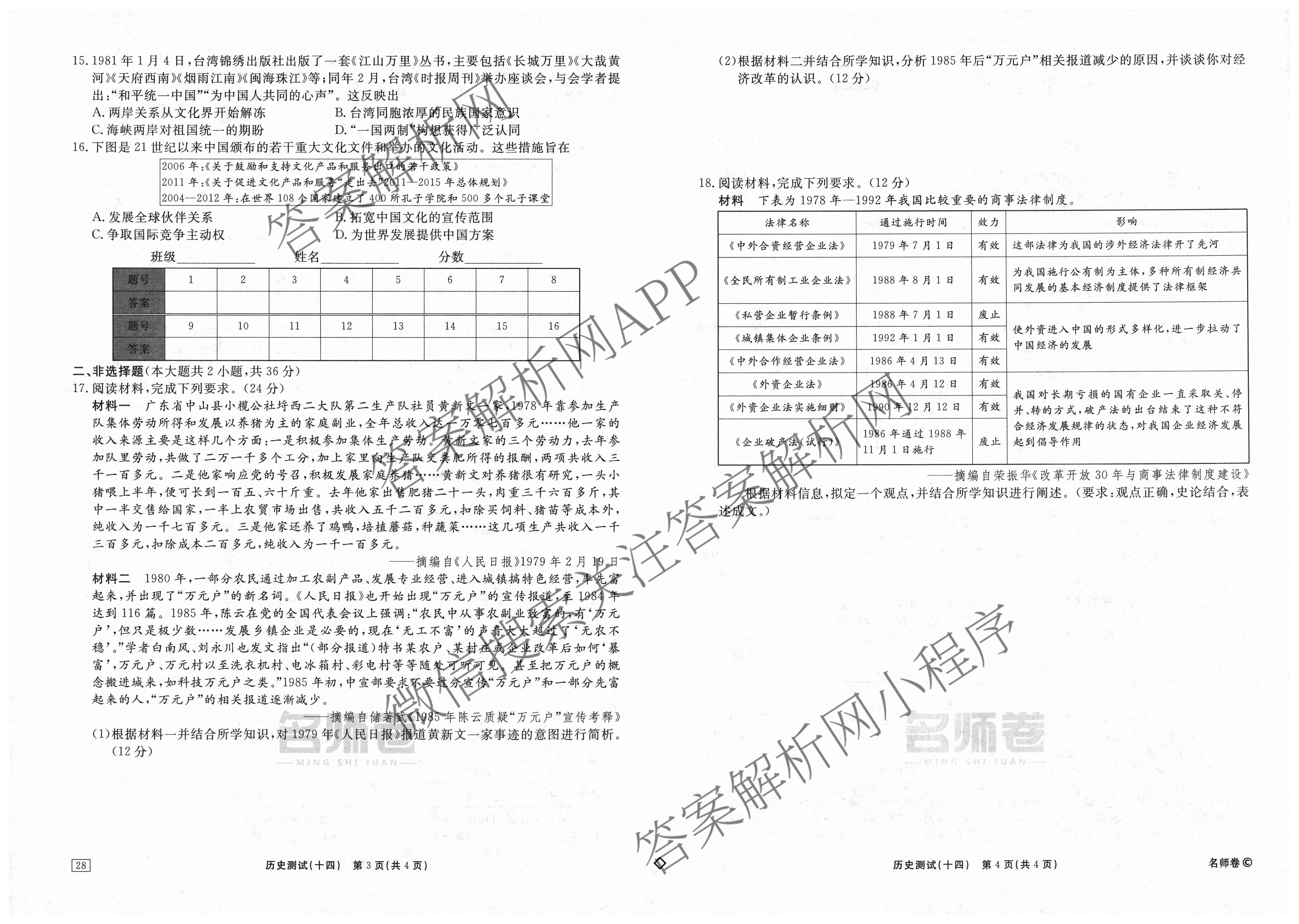 衡水名师卷2025-2026学年度高三一轮复习考点测试卷(十四)14历史(40分钟空心菱形)试题