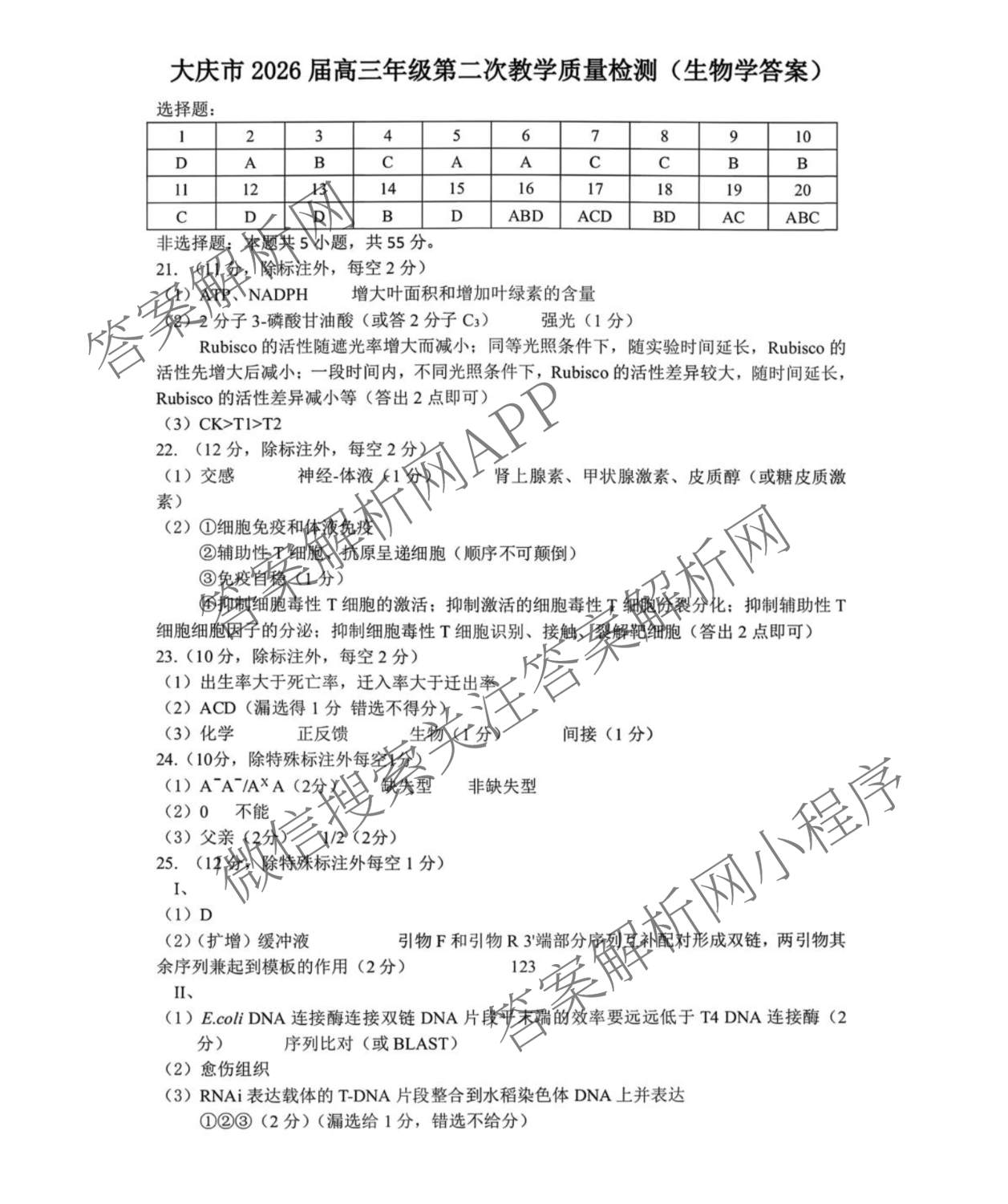 [大庆二模]黑龙江大庆市2026届高三年级第二次教学质量检测生物答案,目前分科卷答案网已经汇总了[大庆二模]黑龙江大庆市2026届高三年级第二次教学质量检测生物答案的各科答案和试卷,获取更多地方模拟答案解析,请在关注本站。