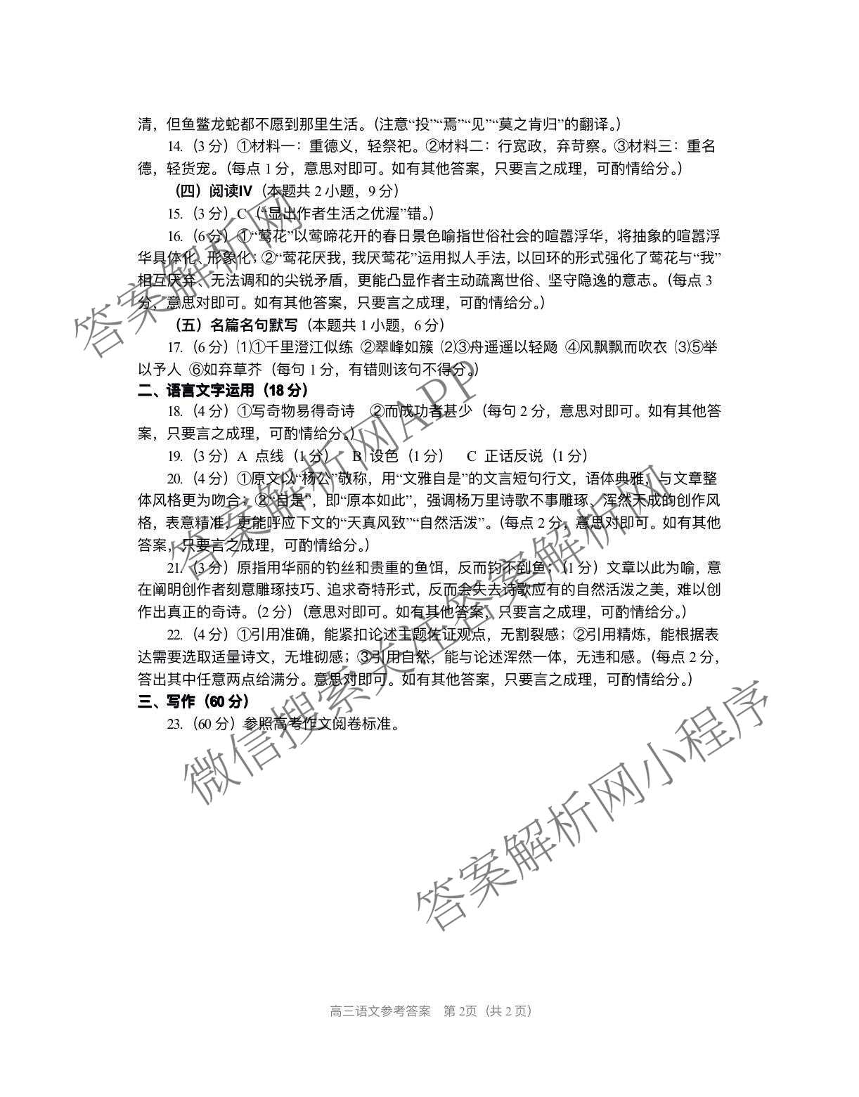 2025~2026高三烟台市学年度第一学期期末学业水平诊断语文答案
