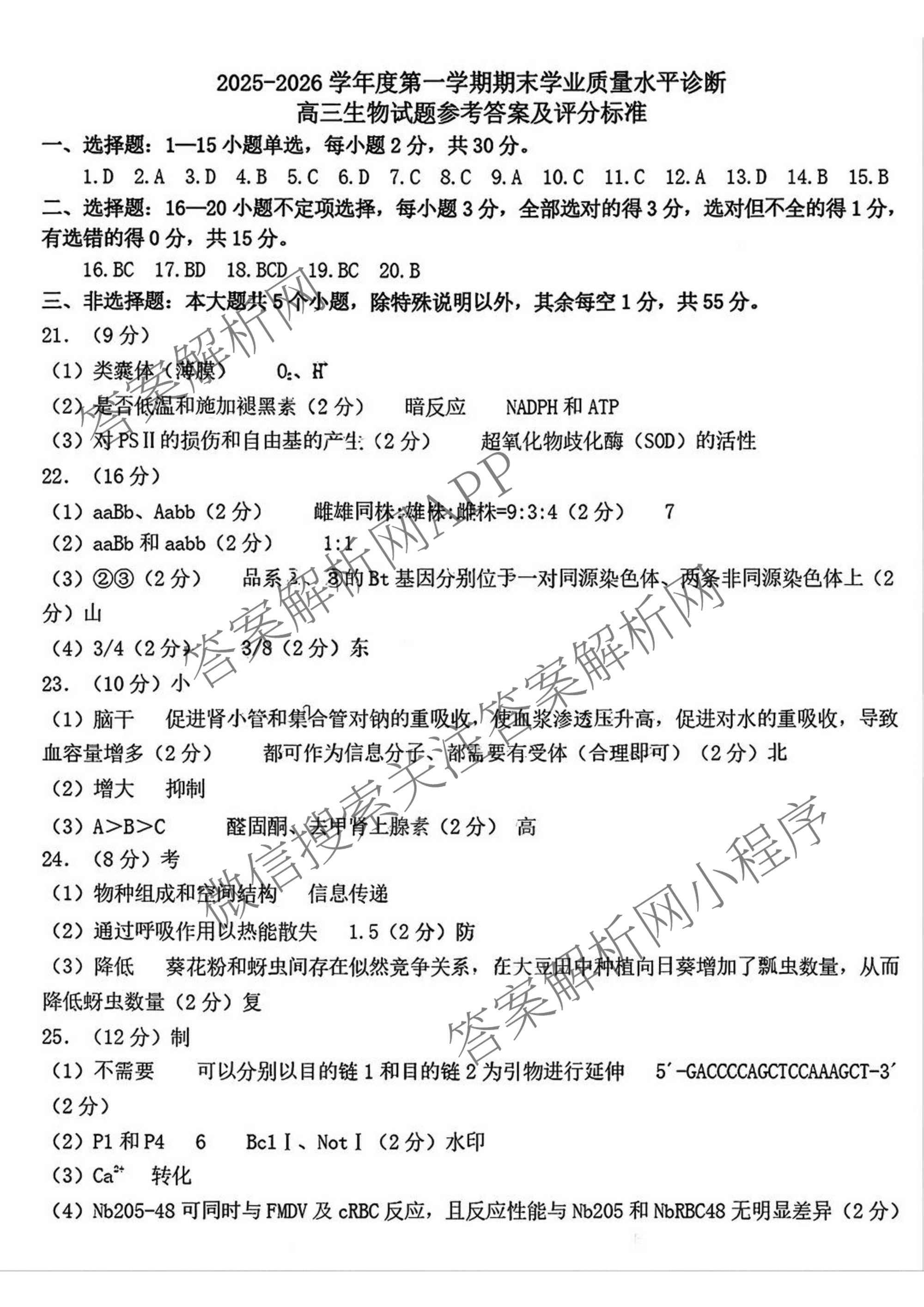 烟台市2025-2026学年度第一学期期末学业水平诊断高三生物答案,目前分科卷答案网已经汇总了烟台市2025-2026学年度第一学期期末学业水平诊断高三生物答案的各科答案和试卷,获取更多地方模拟答案解析,请在关注本站。