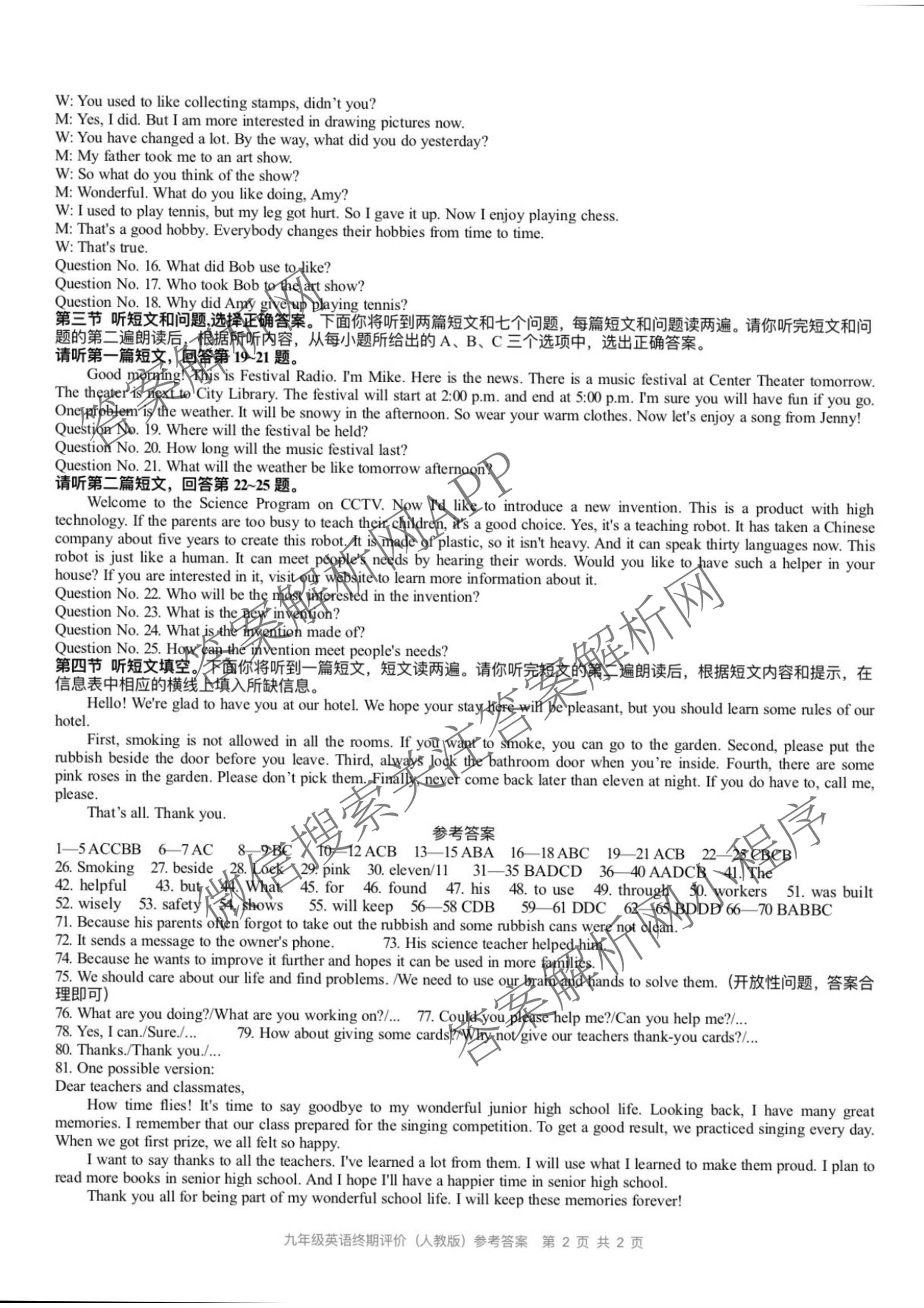 - 河北省2025~2026学年第一学期(九年级)学业水平终期评价英语(人教版)答案