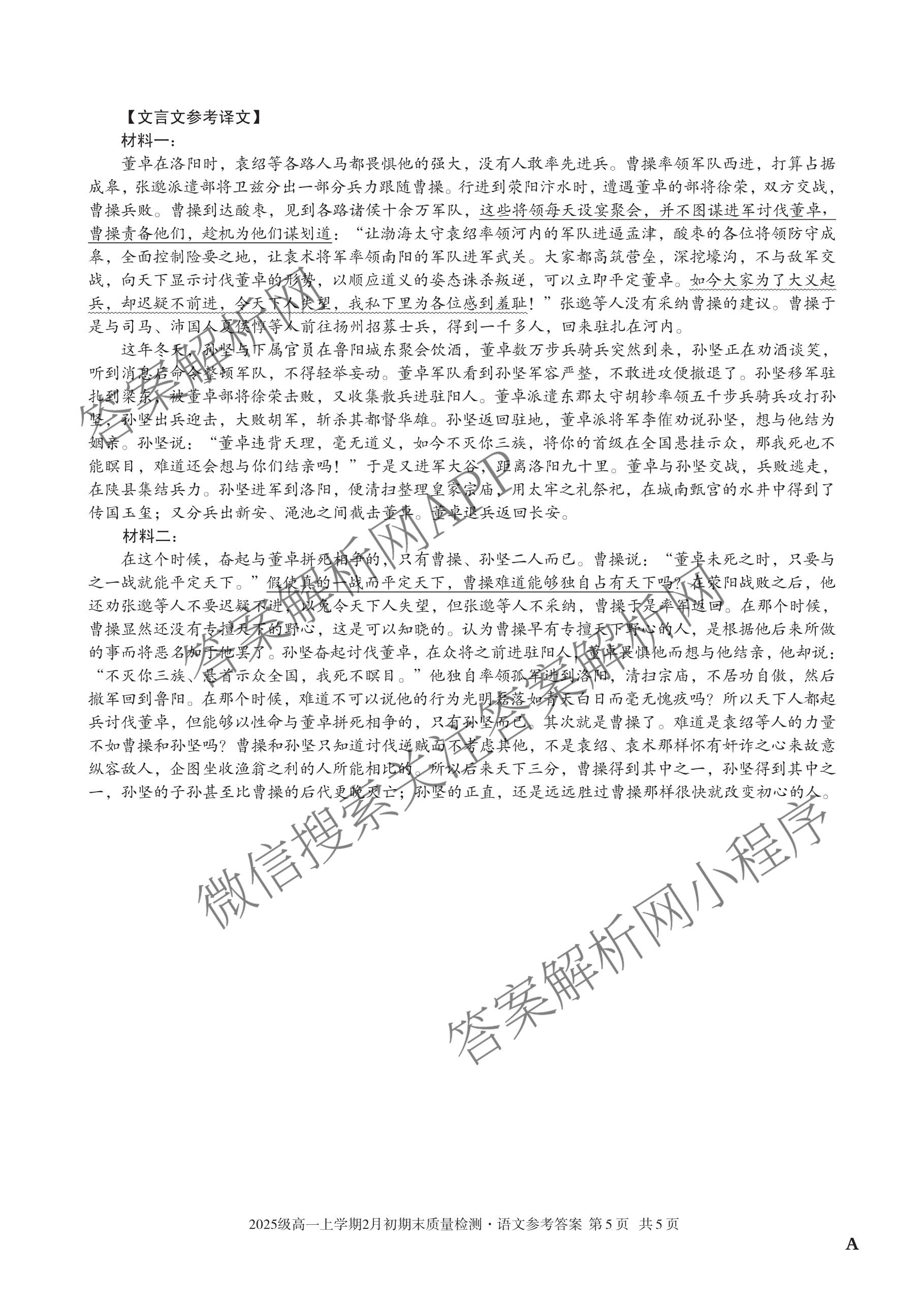 - 高一安徽省2025级上学期2月初期末质量检测语文(A)答案