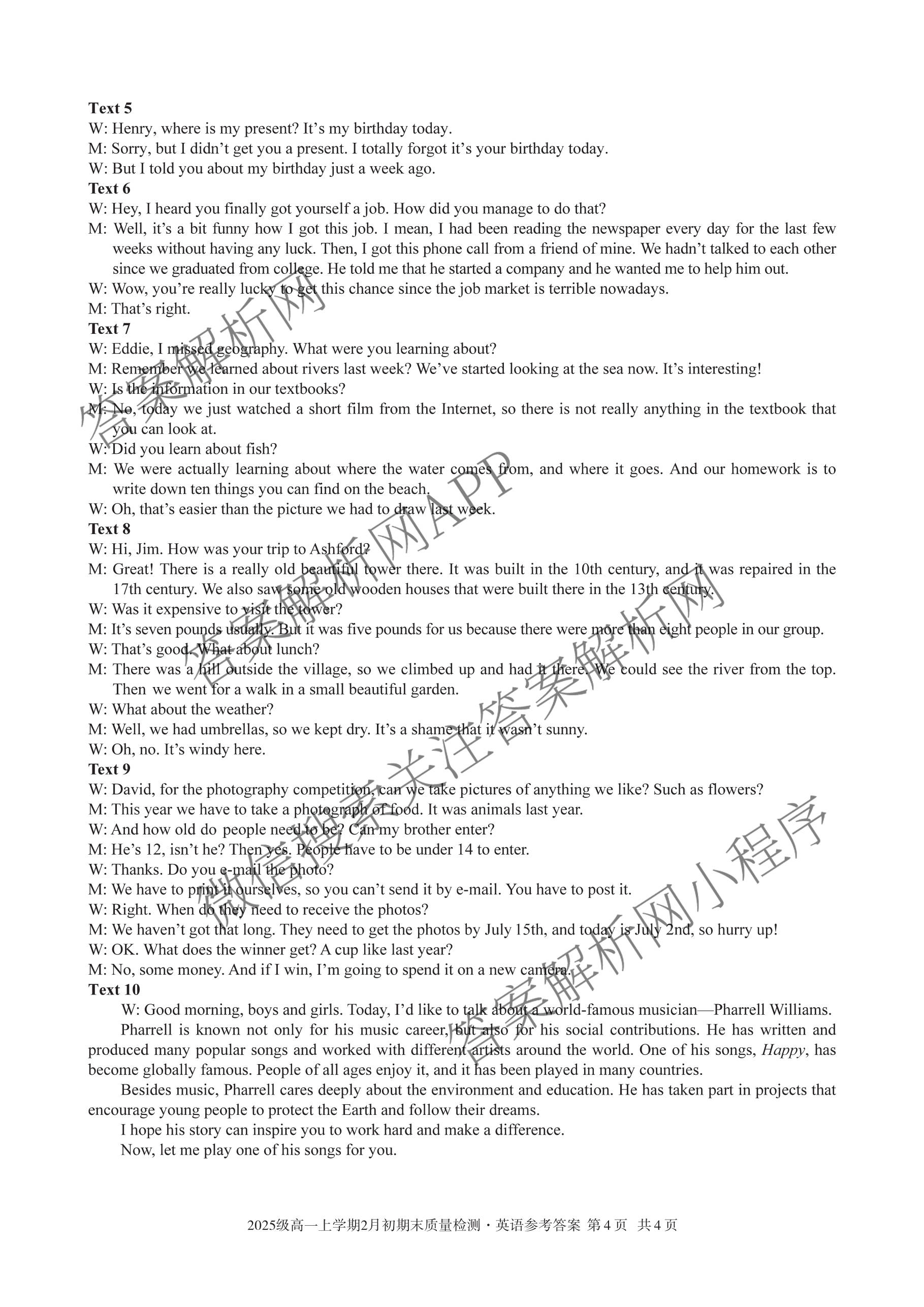 安徽省2025级[高一]上学期2月初期末质量检测英语答案