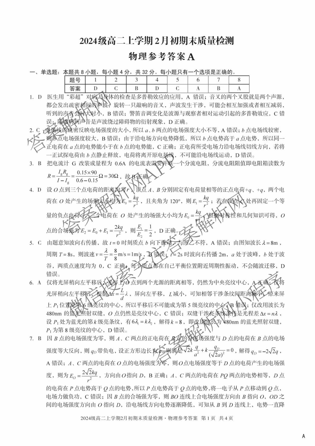 - 安徽省2024级(高二)上学期2月初期末质量检测物理(A)答案