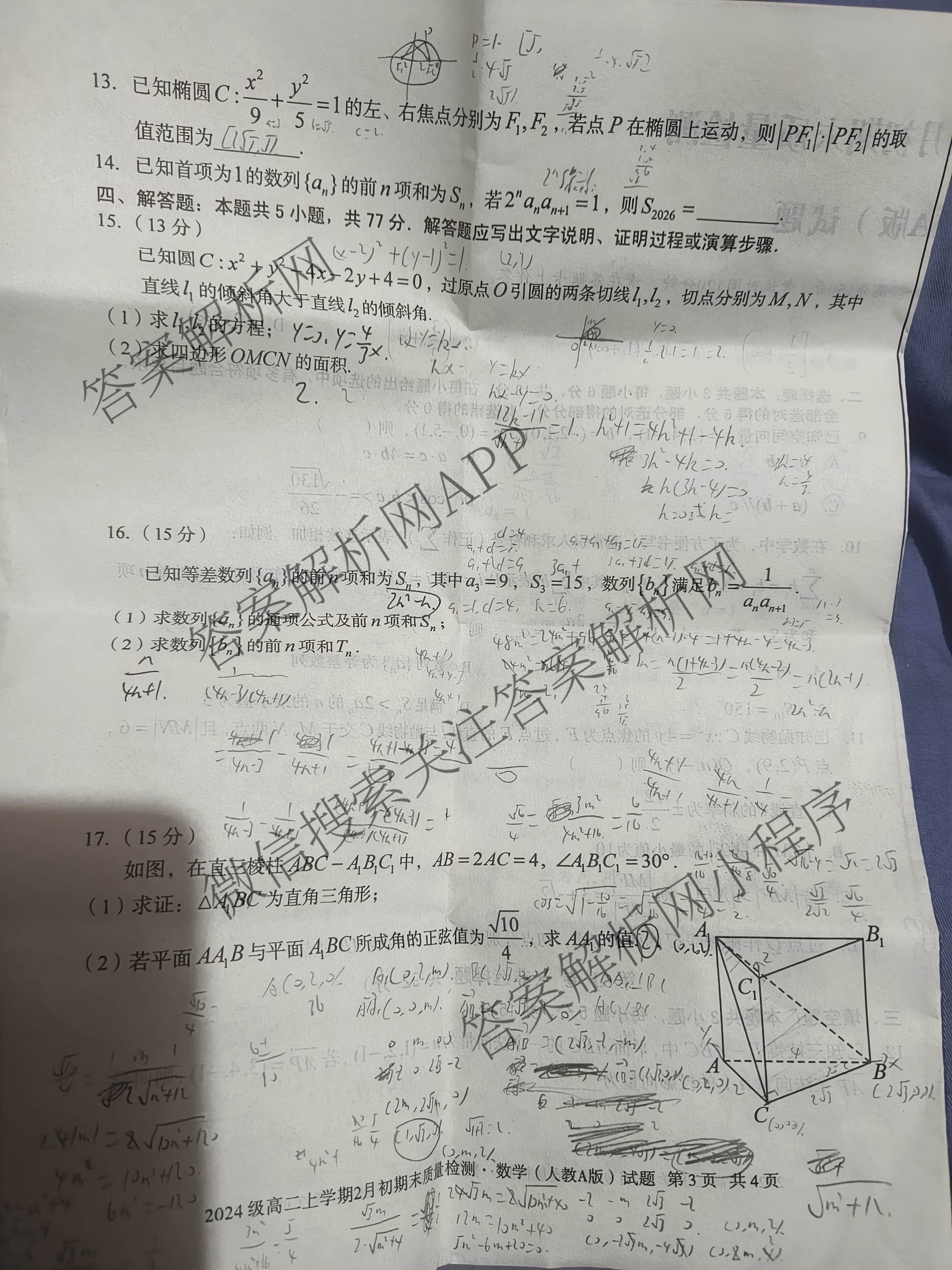 - [高二]安徽省2024级上学期2月初期末质量检测数学(北师大版A)答案