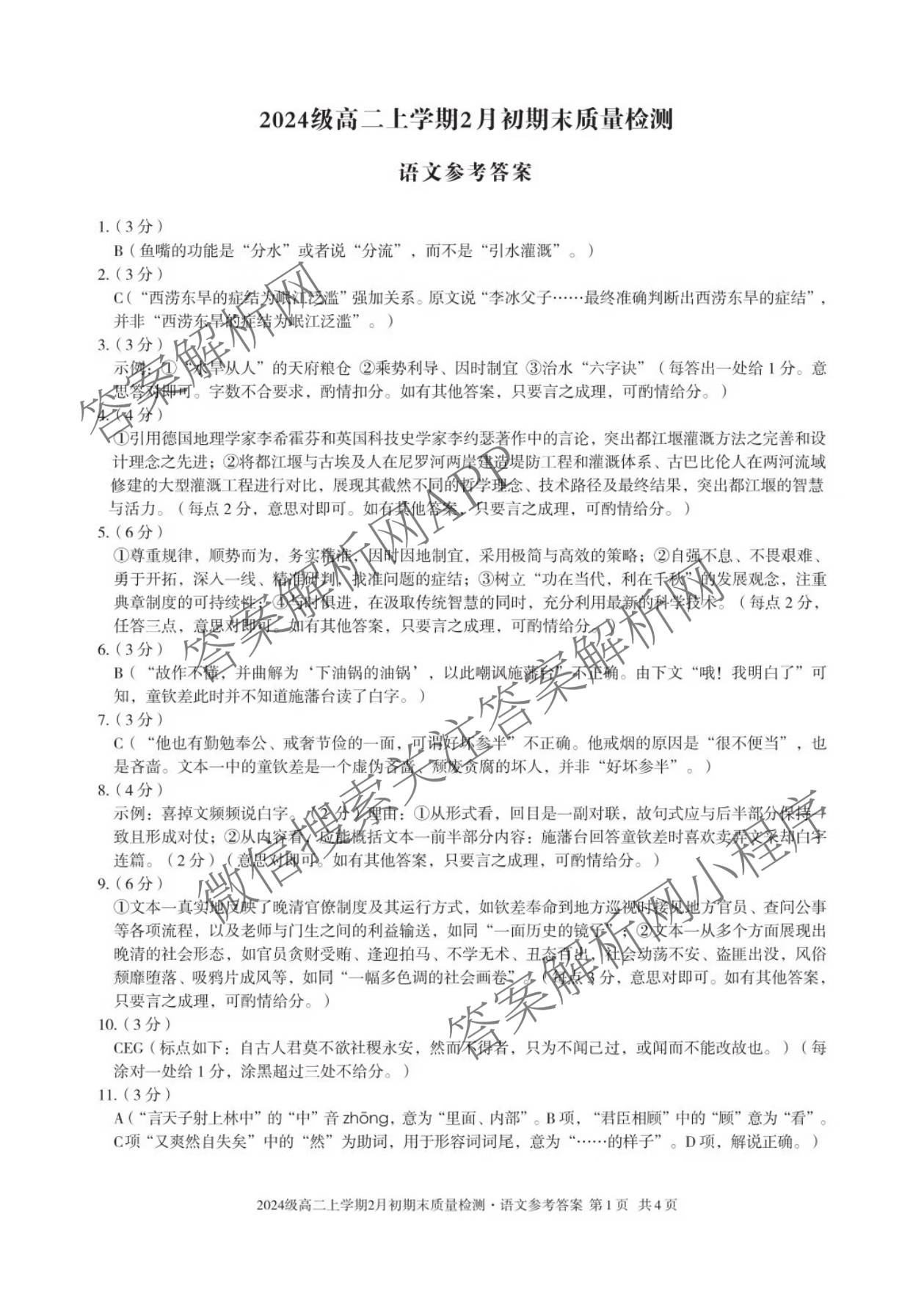 - 安徽省2024级(高二)上学期2月初期末质量检测语文(A)答案