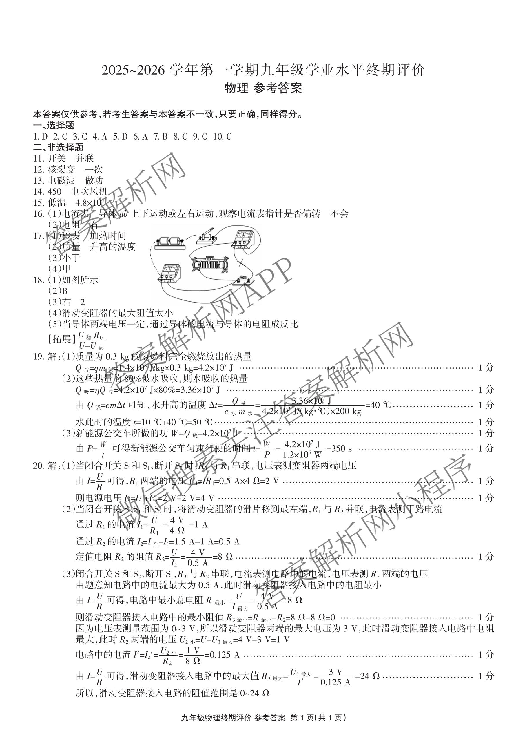 河北省2025~2026学年第一学期(九年级)学业水平终期评价物理答案